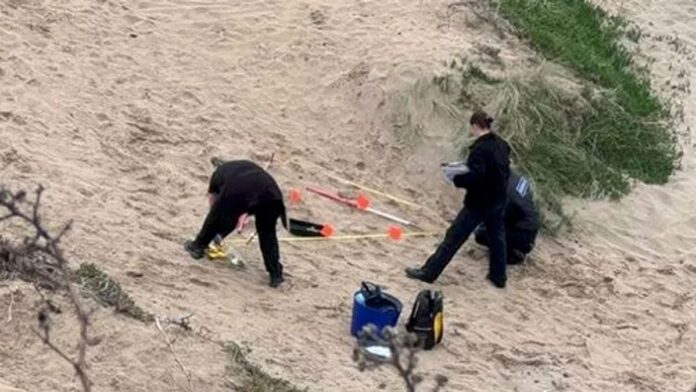 Photos taken by a bystander show authorities conducting excavation work in the cordoned-off area of the beach. Additional lighting was brought in to aid in the investigation during the evening.